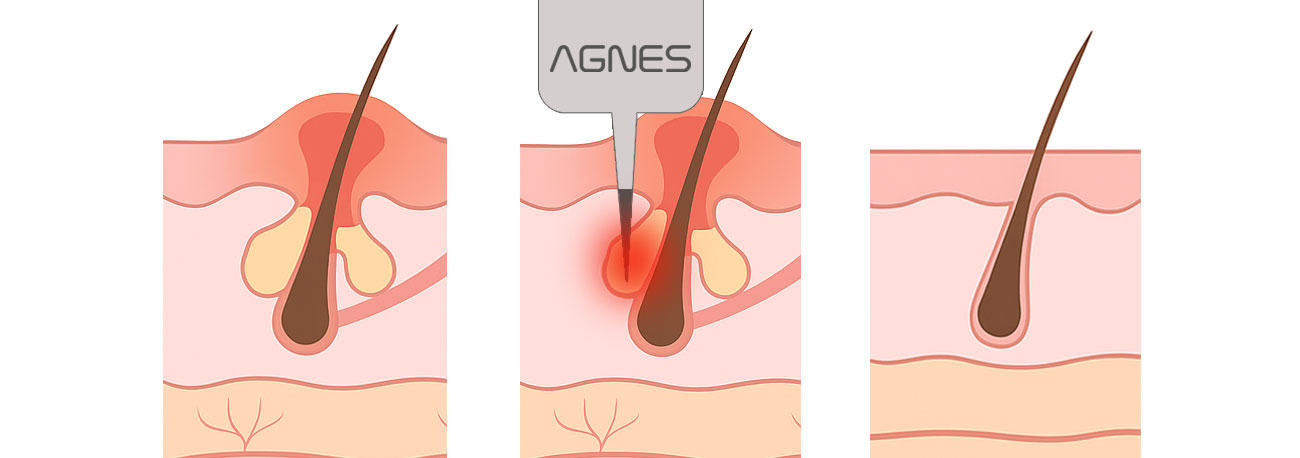 아그네스는 절연 단일 니들을 이용한 고주파(RF) 장비로, 미세침 끝부분에서만 에너지가 전달되어 표피 손상 없이 목표 피지선이나 모낭 구조에 선택적으로 열을 가하는 치료법입니다. 이를 통해 과도하게 발달한 피지선을 축소시키고, 재발을 줄이며 피부결 개선에 도움을 줍니다.
