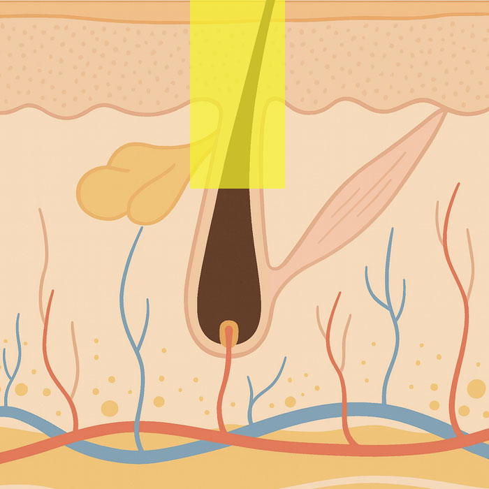 레이저 제모는 모낭의 멜라닌 색소에 빛 에너지가 선택적으로 흡수되어 열로 전환되는 원리를 활용합니다. 이 과정은 모낭 기능을 약화시켜 털의 성장 속도를 줄이는 데 도움을 줄 수 있습니다.
