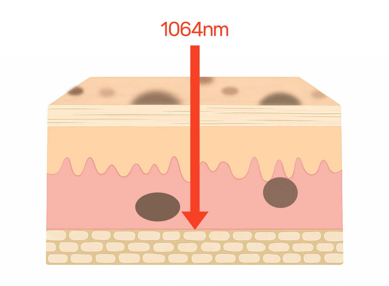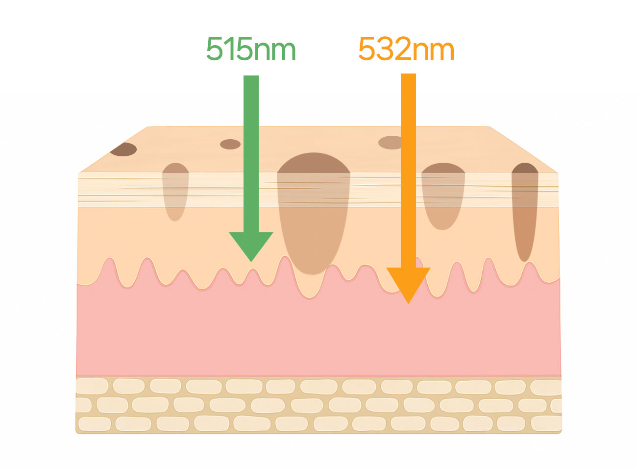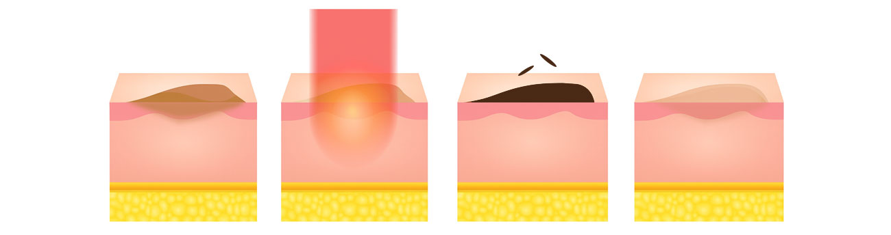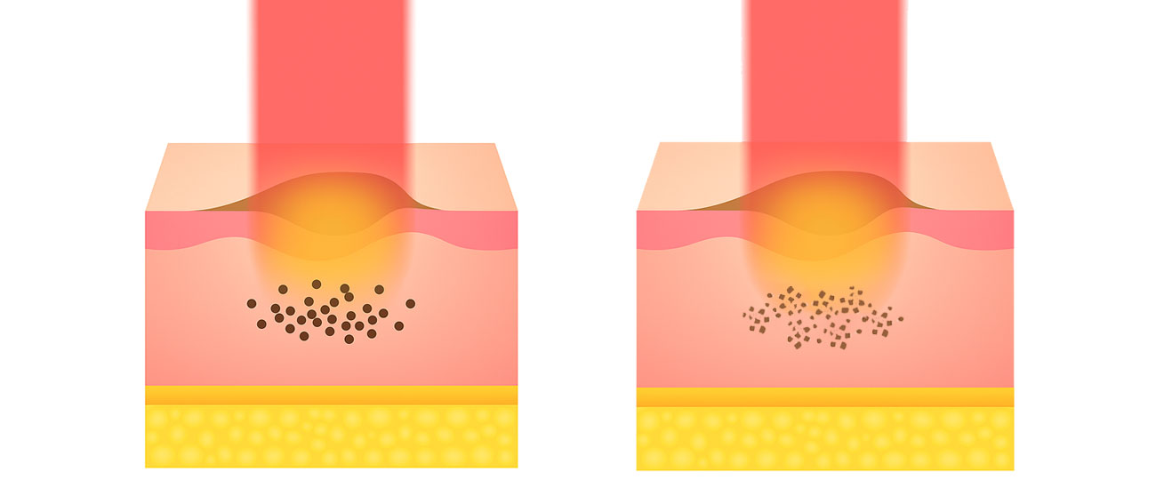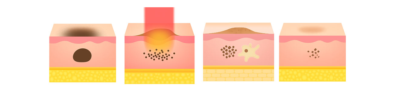 - 레이저 조사 : 선택된 파장이 표피의 멜라닌 색소에 흡수되어, 색소과립(멜라노솜)이 파괴됩니다.
